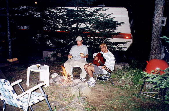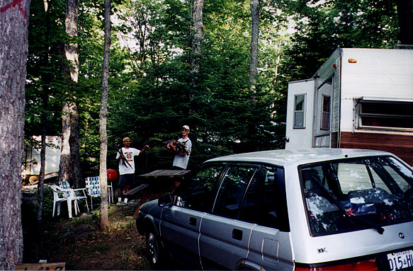 There it is! The Trailer and the silver bullet, and oh yeah guys collecting wood for the coming campfire and eats!